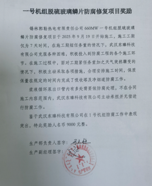 近日,锡林郭勒热电有限责任公司660MW一号机组脱硫玻璃鳞片防腐修复项目圆满落幕,施工方武汉东臻科技有限公司凭借出色的施工表现、高效的执行能力与主动担当的企业精神,赢得了业主单位的高度认可与正式嘉奖,获颁人民币9000元奖励。